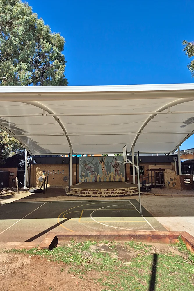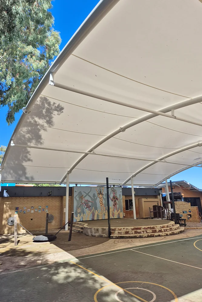 The school needed a versatile shade structure to cover a busy outdoor play area that includes a stage, playground equipment and a mini sports court. Shade Engineering worked with MakMax’s engineering team to adapted our classic TensoCola design to suit the site’s layout, ensuring the canopy provided maximum coverage and architectural appeal.