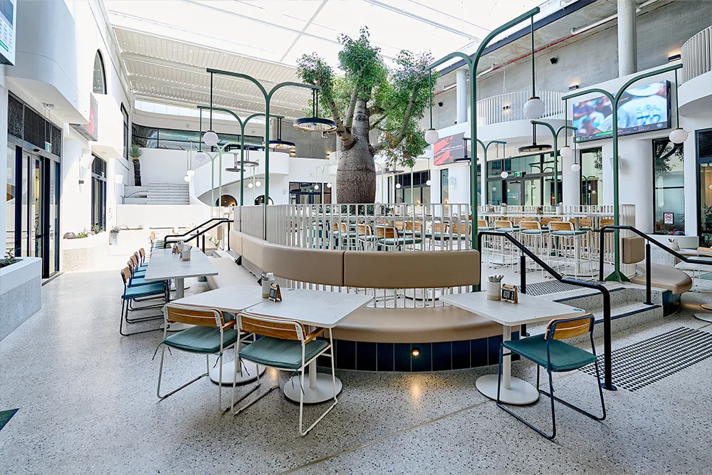 The Oran Park Hotel opened in late 2024, a brand-new entertainment oasis in the heart of Oran Park. Among the hotel’s standout spaces is a garden atrium featuring a live Boab tree at its centre. This striking design element is made possible by the multi-layer ETFE cushions that form the atrium’s skylight, allowing natural light to filter into the indoor dining area.