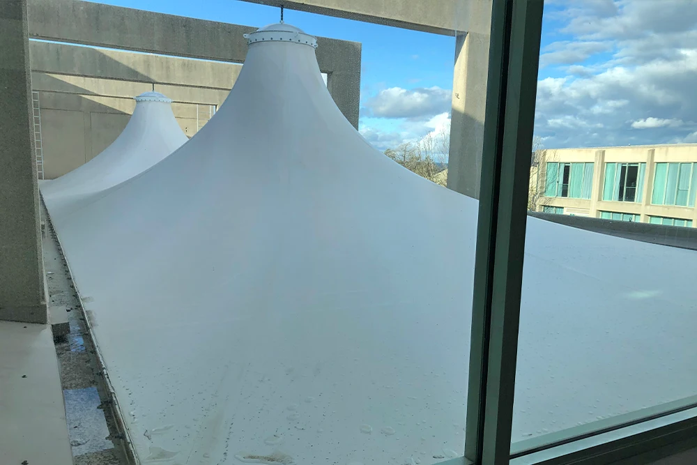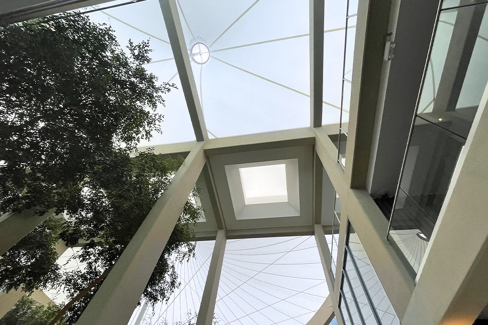 The two tensile membrane roofs, originally constructed using PVC fabric, were in need of replacement due to age and damage. The smaller of the two structures measured 6.5m x 25m and was set within a tight light well, while the larger 8m x 35m structure provided cover to a wider section of the hotel’s internal space. Combined, the two roofs covered 373 square metres of membrane area. As part of the works, MakMax also replaced four smaller polycarbonate skylight domes, approximately 1 metre in diameter, which sit atop each of the conical membrane structures.